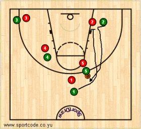 Αν δεν υπάρχει σουτ από τον 3, ο 2 παίζει pick-n-roll με τον 5 με κατεύθυνση προς το κέντρο. Μετά το screen ο 5 κόβει προς το καλάθι. Ο 4 κι ο 1 ανοίγουν στις γωνίες της ίδιας πλευράς για να δημιουργήσουν αποστάσεις κι άρα χώρο για τη συνεργασία του 2 με τον 5.